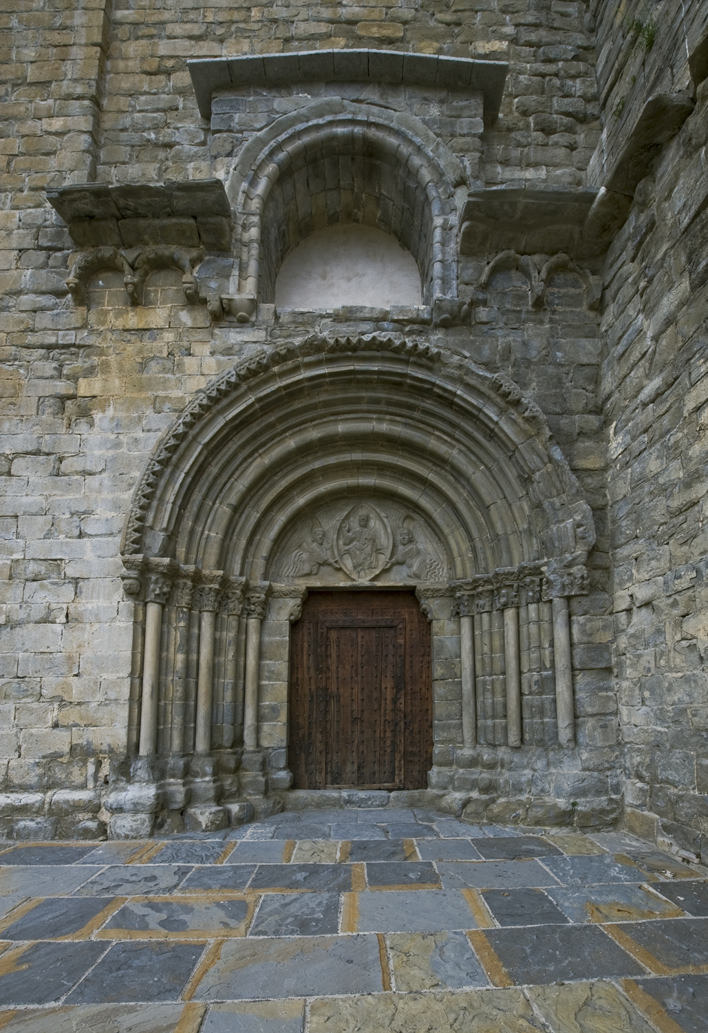 Uno de los elementos más sobresalientes del conjunto es su portada románica, auténtica obra maestra de la escultura medieval. El tímpano alberga un Pantocrátor enmarcado en una mandorla y sostenido por dos ángeles, todo ello rodeado por seis arquivoltas de medio punto. La decoración escultórica incluye figuras que representan escenas y símbolos morales, como el pecado, la lujuria, la gula y el relato bíblico de Adán y Eva, ofreciendo una lección visual a los fieles de la época.