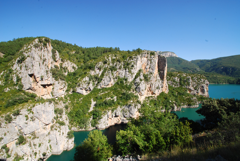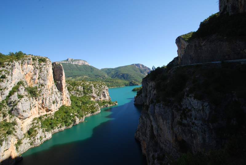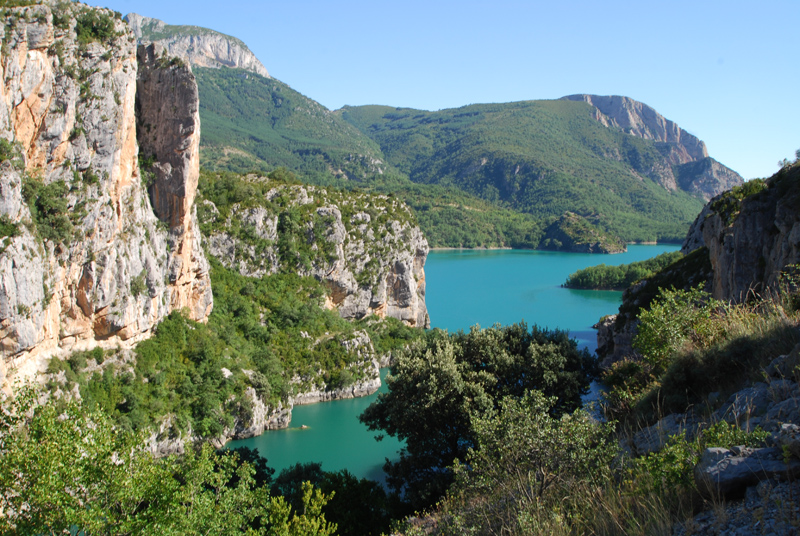 El Embalse d’Escales, situado en plena Ribagorza, es uno de los enclaves más espectaculares del Pirineo aragonés. Construido en 1955, su presa se encuentra en el pintoresco pueblo de Sopeira, mientras que su cola se extiende hasta el municipio de Pont de Suert, alcanzando unos 8 kilómetros de longitud. Sus aguas cristalinas, rodeadas de montañas y formaciones rocosas de gran belleza, convierten este lugar en un escenario privilegiado para disfrutar tanto de la naturaleza como de las actividades deportivas al aire libre.