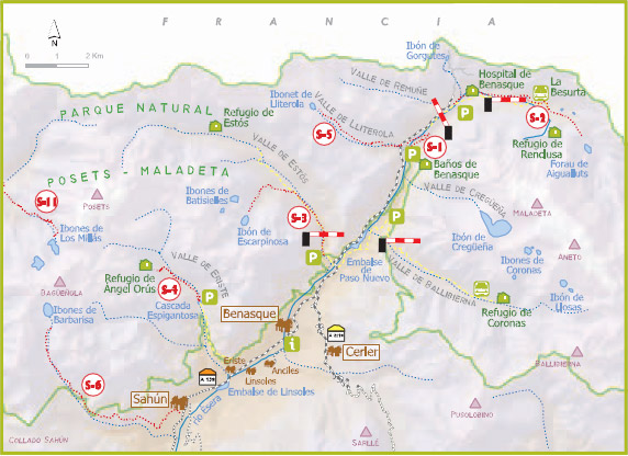 El sendero comienza en el aparcamiento ubicado al inicio del Valle de Estós. La primera parte del sendero coincide con la senda marcada como GR 11 (marcas rojas y blancas). El recorrido pasa por la cabaña de Santa Ana y continúa por la pista hasta encontrar el desvío hacia el Ibonet de Batisielles, que encontraremos señalizado a nuestra izquierda.